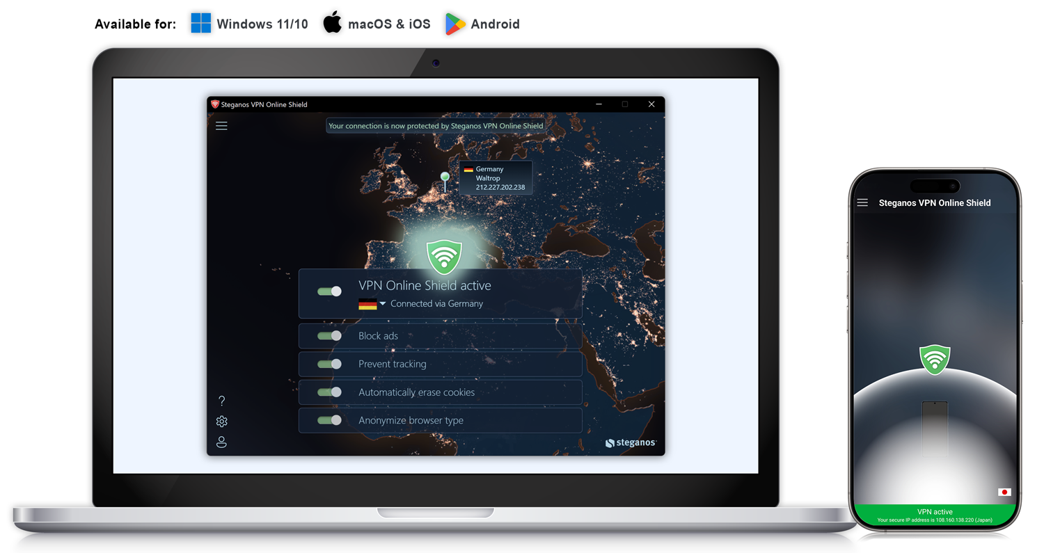 It's your right: don't let anyone spy on you. Steganos VPN Online Shield hides your IP address.